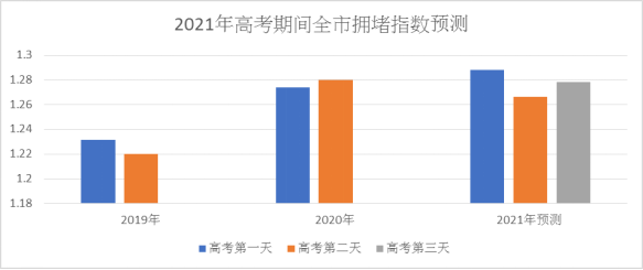 今年高考施行新的考试制度,在6月7日至9日(周一至周三)举行,比往年增加了一天的考试时间。在各大考点周边的路段,因接送考试引发车流量上升,易出现短时车辆缓行情况,以思明区的考点最为明显,而岛外由于考点周边交通较为便利,拥堵情况较为轻微。预测在每日考试的入场离场四个时间段,考点周边拥堵指数会有明显上升。各个考点周边路段早晚高峰的车辆将有明显增长,拥堵指数也同比上升。