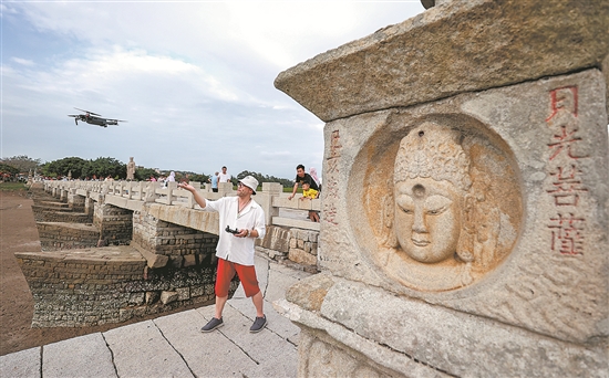 6月6日下午5时许,认为已到了拍摄的黄金时段,来自马来西亚的华裔教授庄以仁(英文名Eugene Ch’ng)操控着无人机,一丝不苟地拍摄着泉州洛阳桥。拍摄下的几百张照片,将通过数字技术进行3D建模。