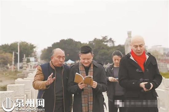 2016年,陈德杉(左一)为央视主持人李佳明等一行介绍洛阳桥。 (资料图片)
