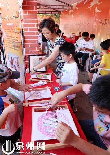 2021年文化和自然遗产日福建主场活动在泉州府文庙举行。图为小朋友在活动现场体验永春纸织画。(陈英杰 摄 )