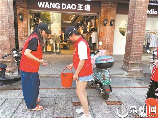 泉州网6月14日讯 (记者 廖培煌 官文庆 文/图)昨日下午3点多,烈日当空。在西街肃清门广场附近,几名身着红马甲的志愿者,正在拾捡路面上的烟头、纸屑和塑料袋等垃圾。