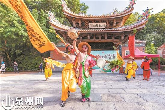 唆啰嗹队伍从五店市东南入口出发,走街串巷为沿街商铺除尘去屑、消灾驱邪,为游客送上节日祝福。“歌唱中的‘嗦啰嗹’就是古越族人辟邪去灾的咒语,这是泉州地区独特的端午习俗。”一位表演者说。