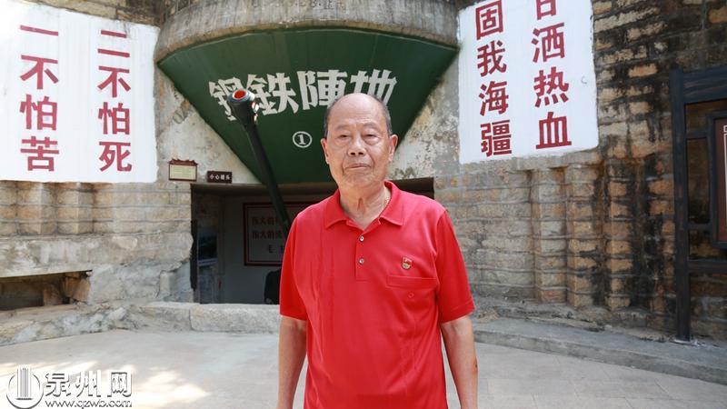 站在安业民烈士战斗过的1号炮位,围头老民兵洪建财回忆战友的英雄事迹(苏维斯 摄)