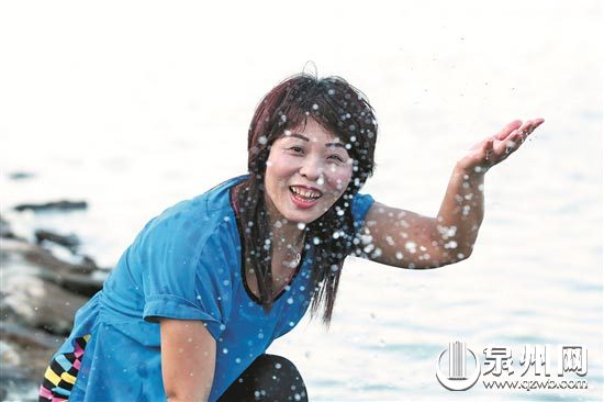 2018年8月7日,在金门县田埔水库,1995年从晋江围头村嫁到金门的洪燕明兴奋地扬起来自家乡晋江的水。(张九强 摄)