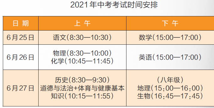 2021年中考省级统一考试安排在本周五、周六、周日举行。除了体育与健康科目中的“身体素质和运动技能”的测试由市教育局组织实施外,其他科目全部实行省级统一考试,以教育部初中学科课程标准为命题依据,实行书面闭卷笔试形式。