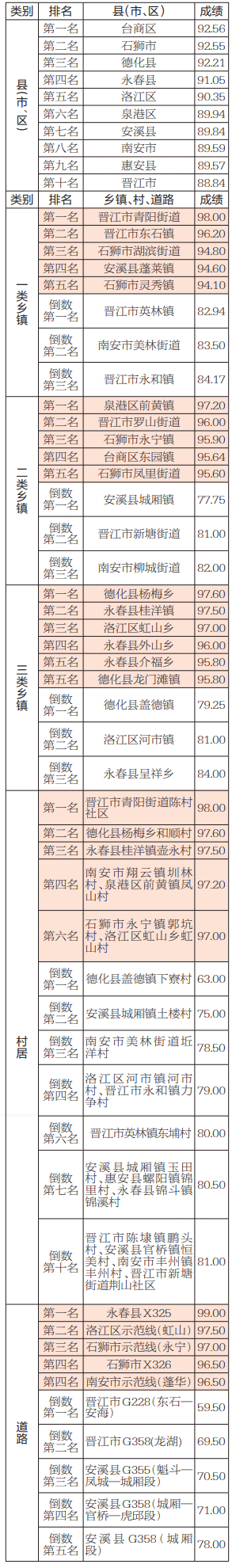 5月份,泉州市城市管理局考评中心抽评10个县(市、区)145个乡镇的243个村、105段道路及三个工业区环境卫生,主要成绩如下: