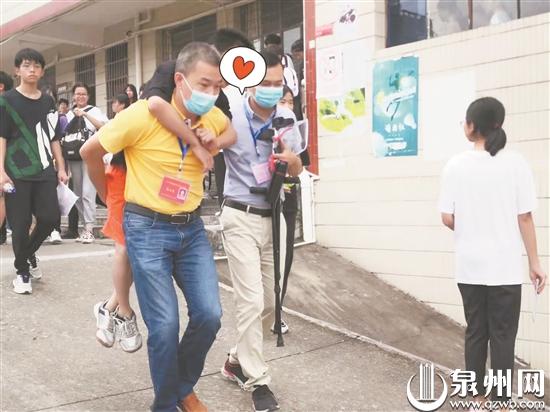 泉州网6月28日讯 (记者陈灵 黄耿煌 文/图)今年中考,在南安市诗山中学考点,大家看到了暖心一幕:一位残疾考生进出考场时,都有老师搀扶或背着他。