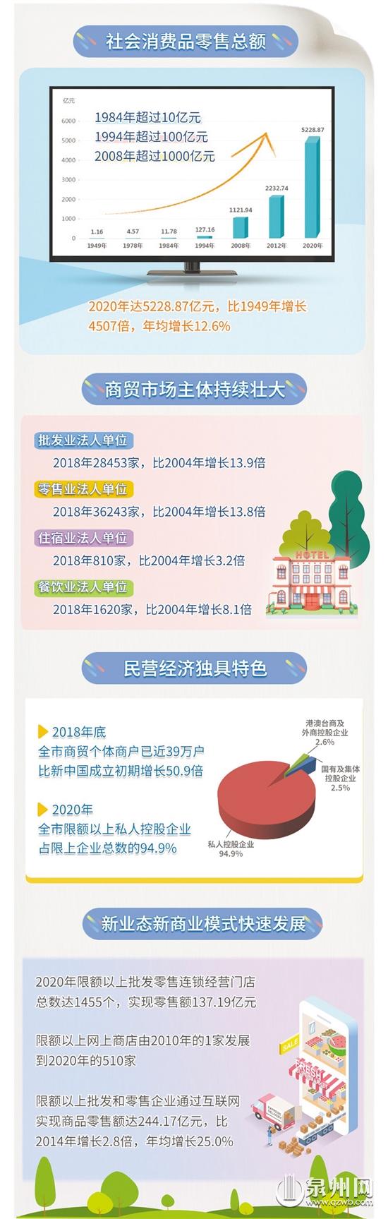 上世纪80年代以前,百货商店、副食品商店、供销社门市、国营饭店等是泉州百姓吃穿用的主要渠道。改革开放后,商品流通体制的改革,促使全市商业经营形式发生了根本的变化。2020年,全市限额以上批发零售连锁经营门店总数达1455个,实现零售额137.19亿元。家居建材商店、专业专卖店等新兴业态快速发展。2020年,全市限额以上零售企业中,专业专卖店902家、家居建材商店32家,单位数分别比2008年增长3.5倍和3.6倍。