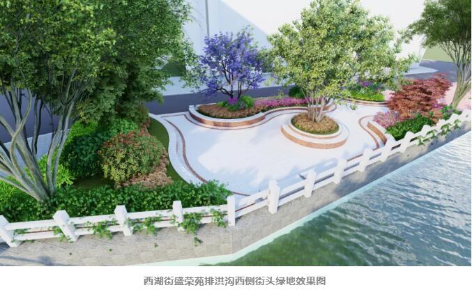 开元街道西湖街盛荣苑排洪沟西侧街头绿地将延续东侧已建成的口袋公园设计风格,增设花池座椅,结合滨水步道打造滨水休闲空间。