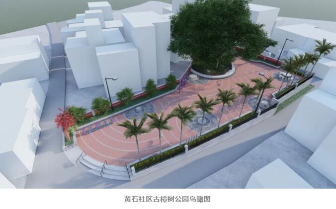 浮桥街道黄石社区古樟树公园以古樟树为主体,铺装红色透水砖,打造波纹纹理,凸显“雨滴叶落,地起涟漪”设计主题。