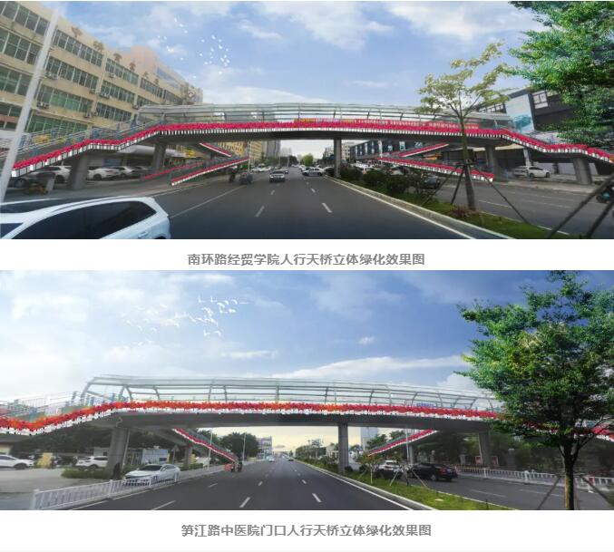 据介绍,南环路经贸学院人行天桥和笋江路中医院门口人行天桥因缺乏立体绿化和彩花,将以外挂三角梅箱的形式进行立体增绿补绿。