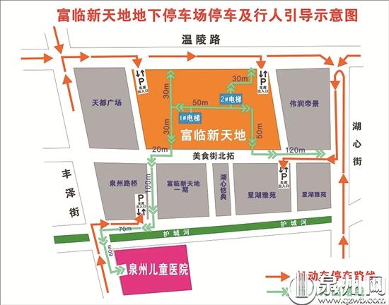 为积极配合交警部门的相关举措,富临新天地主动开放地下停车场负二层800多个空余停车位供市民群众停放,并大量增设停车及步行引导标识,确保停、行畅通。据介绍,该停车场共有4个出入口,停车路线分别为:1.丰泽街行驶车辆往泉州路桥公司方向进入;2.温陵路行驶车辆往温陵路两处入口均可进入;3.湖心街行驶车辆往星湖雅苑方向进入;4.停车后,市民朋友可分别乘坐1号电梯往儿童医院和温陵路方向,乘坐2号电梯往温陵路和湖心街方向。