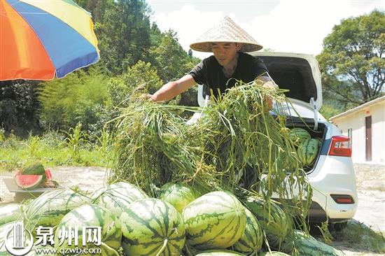 泉州网7月18日讯 (记者陈明华 通讯员吴有森 文/图)近日,德化县汤头乡岭脚村村民赖育才早早地来到自家的瓜田采摘西瓜,再装车送往县城售卖。