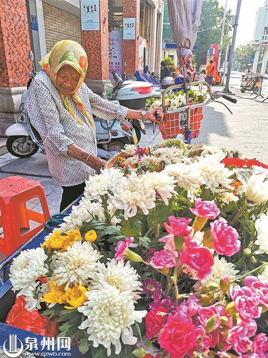 “来买花咯,非常香。”每天早上,无论晴雨,在古城西街靠钟楼的街口,不少人能见到一个头包围巾的阿婆在卖花,她就是许多老泉州人熟识的“花婆婆”曾毛治。