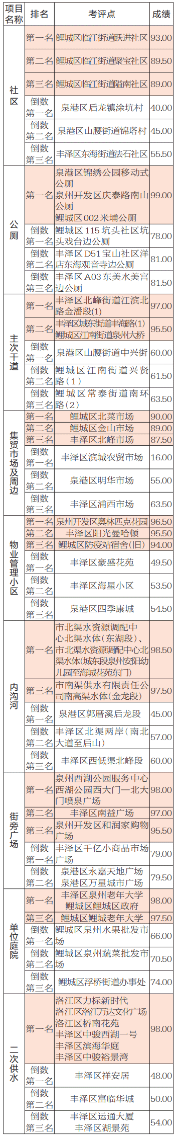6月份,泉州市城管局考评中心共抽评中心城区的83个社区、105条次主次干道、110个住宅小区、22座集贸市场、14座便民市场、95座公厕、39个街旁广场、50段内沟河、5段江岸带、31个单位庭院、107个二次供水小区,共发现问题6301处。经测算,各区城市管理各项目考评总成绩为:泉州开发区84.80分,排名第一;鲤城区82.77分,排名第二; 洛江区81.51分,排名第三; 丰泽区80.95分,排名第四;泉港区68.51分,排名第五。