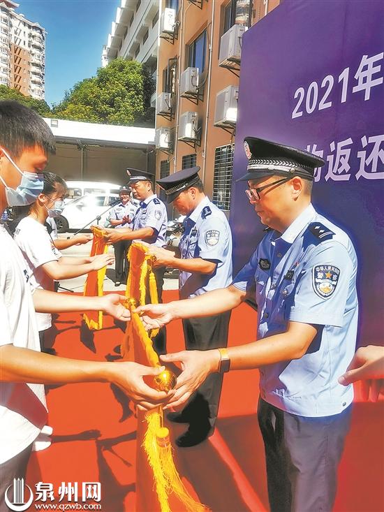 泉州网7月27日讯 (本社记者王丽虹 王盼琛 通讯员郑巧丽 陈亚明 文/图)昨日上午,鲤城公安分局组织召开2021年赃款赃物返还大会,现场向受害群众公开返还近期破获各类侵财案件追回的财物,其中现金22.23万元,珠宝首饰价值20余万元,计算机9台,轿车1部,被盗电动车多部等。