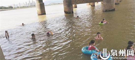 笋江桥下有不少孩子在游泳、戏水。