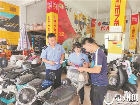 在检查中,执法人员还对辖区电动自行车经营者开展宣传教育,特别是加强《电动自行车安全技术规范》《泉州市中心市区电动自行车管理办法》等法律法规规章及规范性文件的宣传,鼓励经营单位主动签订依法经营承诺书,加强自查自纠自改,严格落实产品质量主体责任。