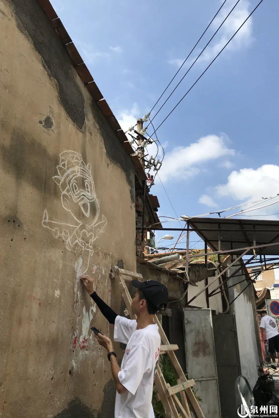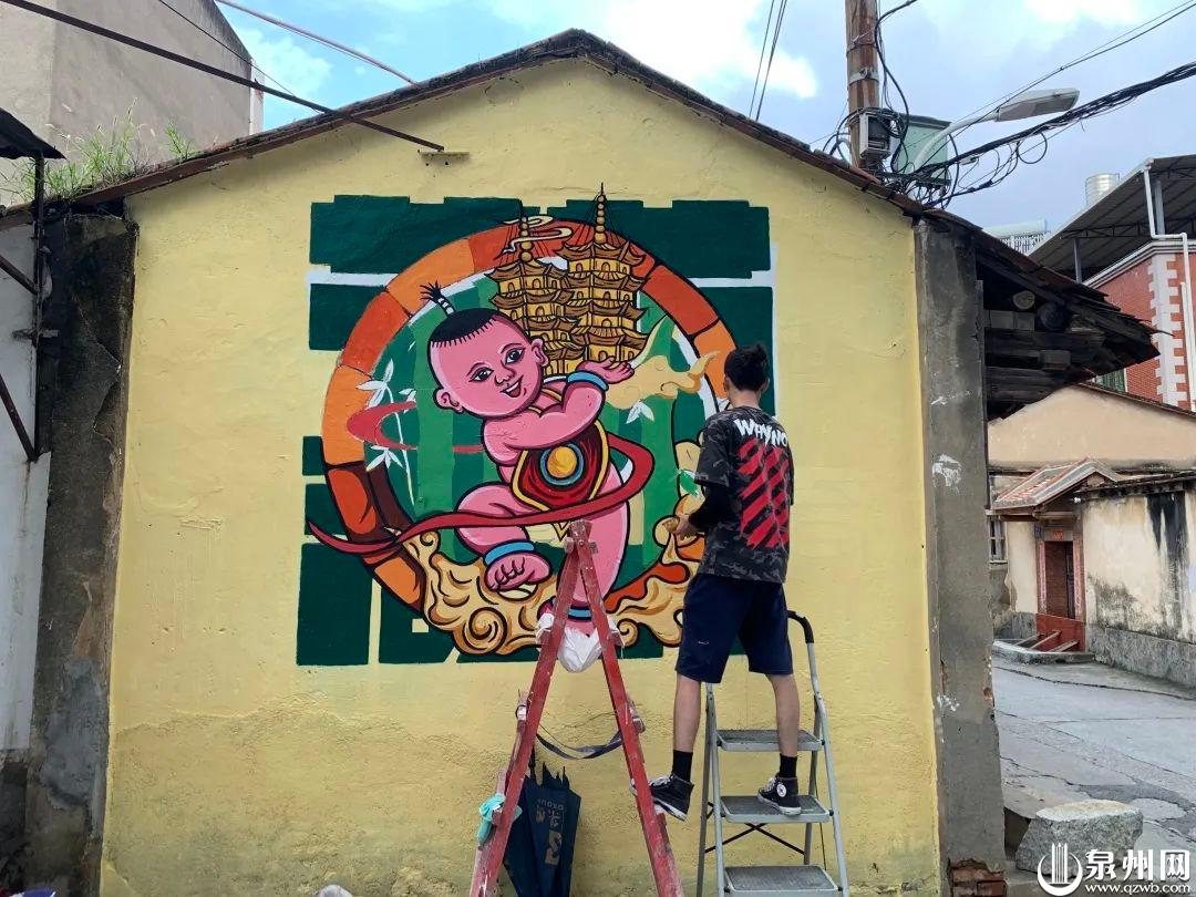 昨天,记者来在开元街道广平仓,只见几位年轻人手拿画笔,忙着在一面旧墙上勾轮廓、涂色彩,时不时有居民驻足观看。“这个抱着东西塔的胖娃娃叫‘鲤小福’,是我们设计的原创形象。”郑少东是此次墙绘创作团队——泉州对面视觉创意机构的负责人,连日来,他们晚上投影打样,白天上色,虽然天气不佳,但丝毫不影响他们创作的热情,“墙绘采用的都是专业的丙烯颜料,不仅防水防晒,并且能确保墙绘颜色更持久。”绘画师陈杨杭介绍道。