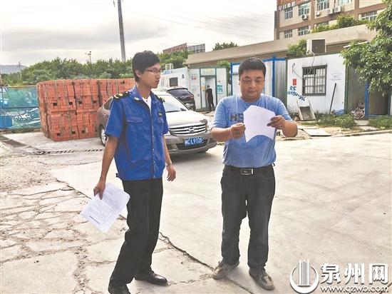 鲤城城管入工地告知台风注意事项 (王金植 摄)