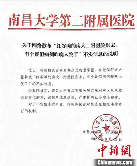 中新网南昌8月12日电 (记者 吴鹏泉)针对网传“红谷滩的南大二附医院别去,有个疑似病例昨晚入院了”情况,中共南昌市红谷滩区委宣传部官方微信公众号“红谷滩发布”12日晚间发布通报辟谣,经核实,该信息纯属谣言。