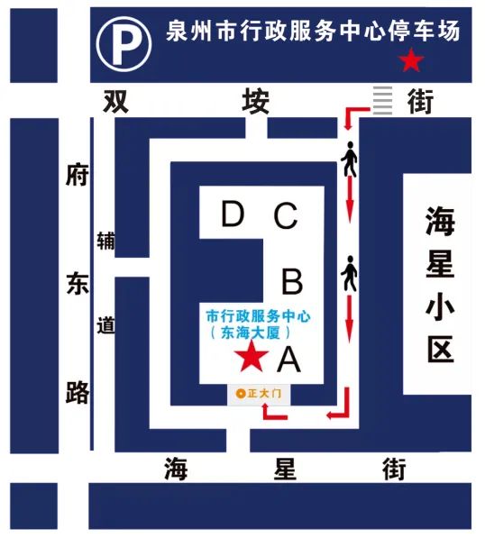 自驾车办事群众将车辆停放在泉州市行政服务中心停车场后,可按下图步行到达市行政服务中心A栋正大门,进入行政服务中心。