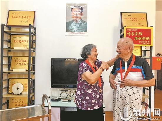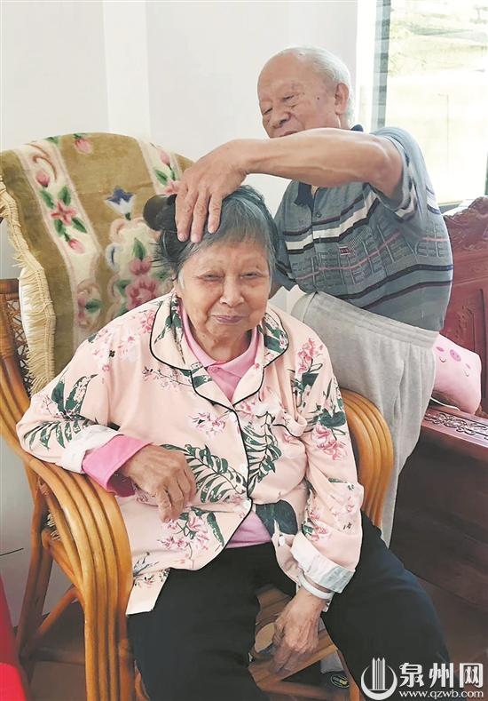 泉州网8月14日讯 (记者 陈灵 文/图)洗完头发,86岁的陈秀菊拿毛巾简单擦一擦,便坐到藤椅上。同为86岁的丈夫陈锦斌站到她身侧,右手持电吹风,左手轻轻拨着妻子的银发,帮她把头发吹干,再用棉签小心地擦拭耳朵……这“秀恩爱”的场景,是这对婚龄65年老夫妇的日常。同年出生,同年入党,他们结婚65年来相亲相爱、共渡难关。今天是中国传统节日“七夕”,被称为中国“情人节”。昨日,老夫妇的晚辈来到他们位于惠安东桥莲塘村的家,提前为他们庆祝节日。