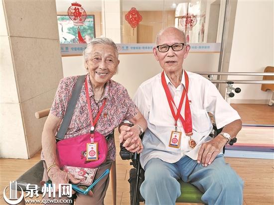 在泉州江南老年颐乐园接待中心,88岁的黄丽琨坐在电动轮椅上,85岁的黄秀花牵着他的手,紧紧依偎着。