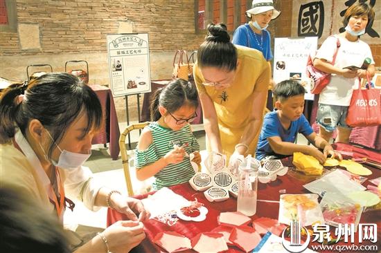 刻纸、藤编、漆篮、雕塑、珠绣、花灯……21日,位于市区少林路的刺桐时代村里,一场“低调奢华”的非遗技艺展示活动吸引着家长和孩子们前往体验。记者在现场看到,富有年代感的“街巷”里,身怀刻纸、漆篮、雕塑、花灯等非遗技艺的传承人们,一边展示自己创作的非遗作品,一边现场传授创作经验;不少小学生在家长的陪同下徜徉非遗市集,感受匠心传承,并积极参与糖画、妆糕人、花灯、雕塑等非遗项目制作体验。“这是我第二次制作花灯。”在花灯DIY区域,即将上小学一年级的林诗洋在现场非遗传承人的指导下,耐心地折叠纸板、粘上双面胶,一个步骤一个步骤完成无骨花灯的制作,“太有意思了,让我学习到了不同年代的各种知识。”