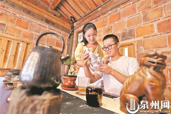 今年,泉州申遗成功的好消息传来,这对90后夫妻下决心回乡创业。于是,他们回到从小长大的地方开了一家文化茶书房,把历经风雨的风狮爷、略微风化的石观音、闽南传统古石雕等宝贝都搬来了,还融入了闽南传统茶文化。