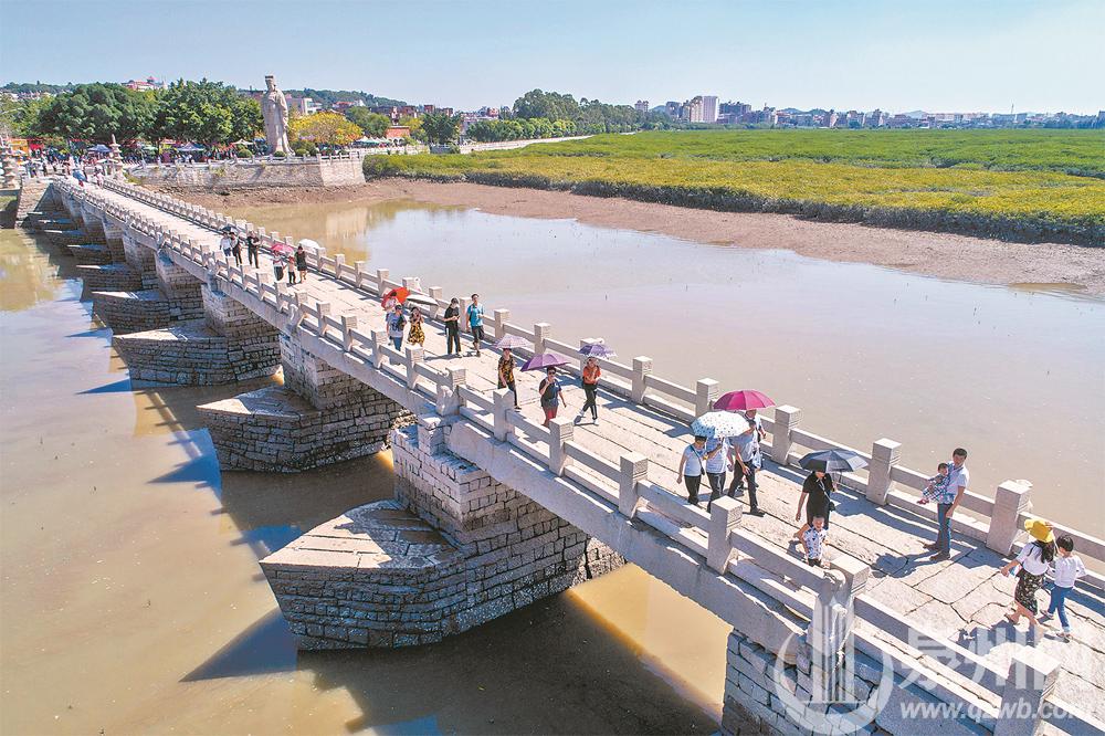 每年假期,洛阳桥上游客络绎不绝。人们漫步桥上,感受海丝魅力。(陈起拓 摄)