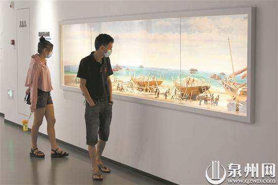 游客在泉州湾古船陈列馆观看泉州湾宋代古船复原模型