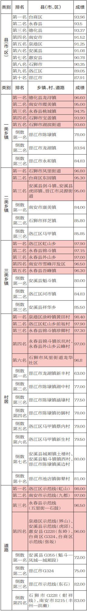 7月份,泉州市城市管理局考评中心抽评10个县(市、区)145个乡镇的248个村、66段道路及三个工业区的环境卫生,主要成绩如下: