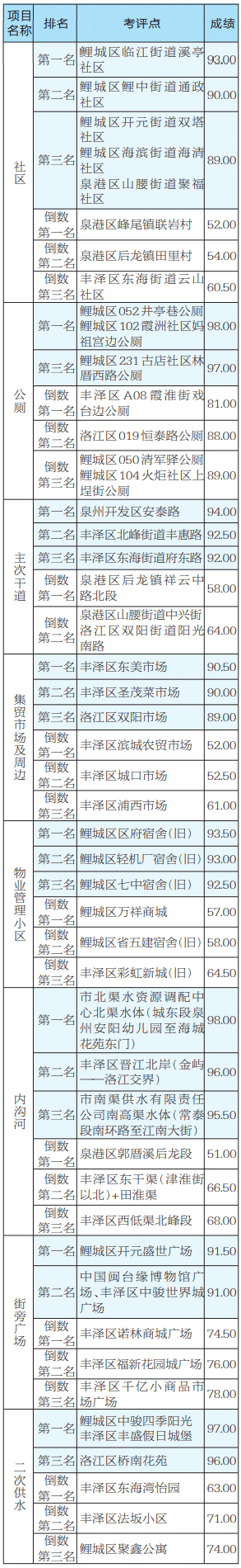 7月份,市城管局考评中心共抽评68个社区、63条次主次干道、77个住宅小区、21座次集贸市场、39座公厕、19个街旁广场、30段内沟河、5段江岸带,16个二次供水单位,共发现问题3794处。各区各项目考评总成绩情况如下:泉州开发区83.66分,排名第一;鲤城区81.87分,排名第二;洛江区81.54分,排名第三;丰泽区79.89分,排名第四;泉港区75.49分,排名第五。