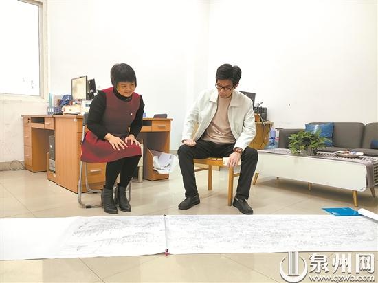 去年6月,泉州海外交通史博物馆申遗总展示馆将创作《刺桐梦华图》的任务交给蔡永辉,蔡永辉找来擅长山水的许瑞珍配合自己创作。在与主管部门确定完构图框架后,蔡永辉与许瑞珍做了分工。擅长大型主题画创作的蔡永辉负责整体场景和画卷中人物动态的细致描绘,许瑞珍则更多地配合他展开景物绘制。