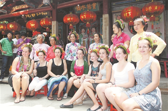 2011年8月2日,在泉州丰泽东海蟳埔社区,来自泉州友好城市—德国诺伊施塔特市的女生学着蟳埔女“簪花围”。(陈英杰 摄)