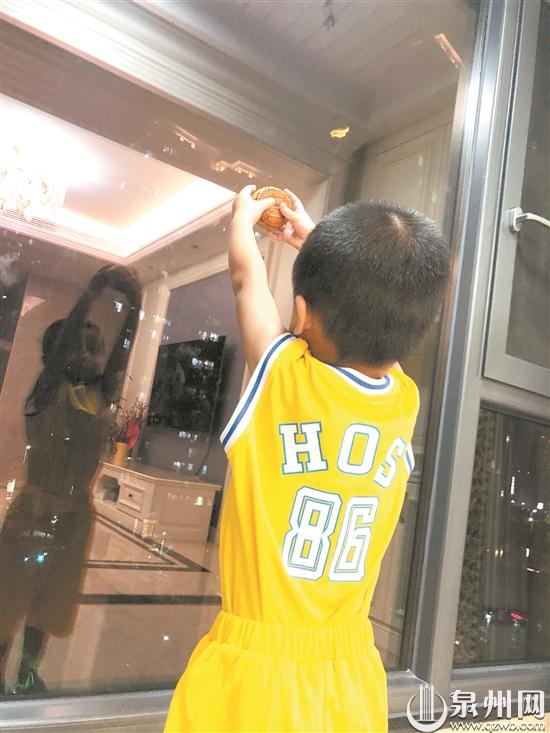 小儿子拿着月饼对着月亮许愿,希望坚守一线的爸爸妈妈能早日回来。