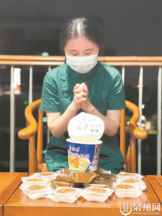 在吴明华提供的生日会视频中,记者看到,吴鑫鑫的蛋糕是用月饼和桶装泡面垒成的,蜡烛由棉签替代。队员们还用方便面调味料粉描出了“26”字样,并在泡面的杯盖上写着“生日快乐 福建加油”的祝福语。为了确保安全,队员们并未点燃棉签,而是用口红将棉签涂成红色,代表点燃的火焰。蛋糕虽然简陋,但队友们高唱着《生日歌》将氛围推向了高潮。