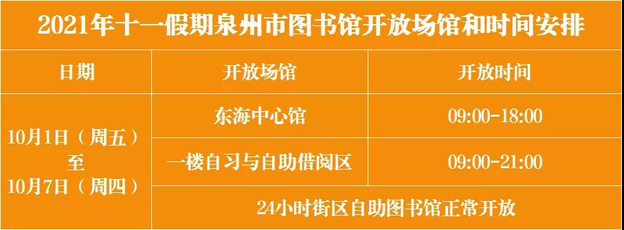 泉州市图书馆(东海中心馆)、24小时街区自助图书馆于2021年10月1日(星期五)起恢复对外开放;刺桐路少儿分馆和馆属百姓书房暂缓开放。结合市图书馆工作实际情况,十一假期(2021年10月1日至7日)泉州市图书馆开放时间如下: