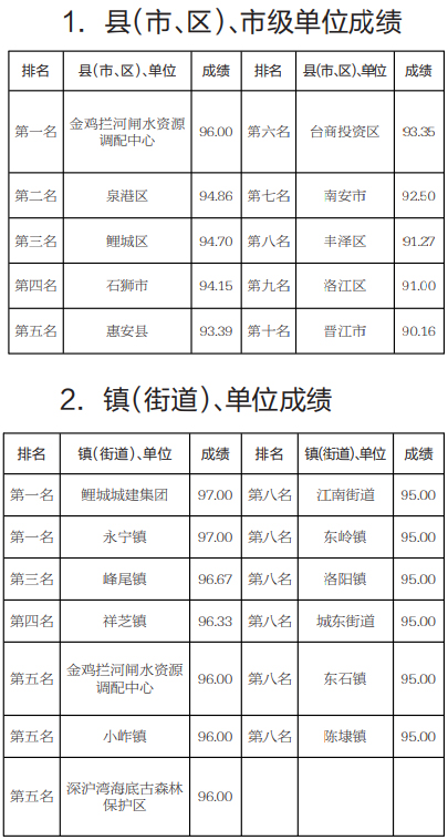 泉州网10月8日讯 (记者吴志明 通讯员邱一漫)8月份,泉州市城市管理综合考评中心对全市海岸带(近岸海域和海岸线向陆一侧200米的陆域)和晋江入海口至金鸡拦河闸上游100米的晋江河道环境卫生情况进行考评。其中,在各县(市、区)、市级单位中,金鸡拦河闸水资源调配中心再次夺魁,晋江市再次倒数第一。而从各镇(街道)、单位成绩来看,鲤城城建集团获得第一名,江南街道、东岭镇、洛阳镇、城东街道、东石镇、陈埭镇等并列第八名。(具体成绩详见下图)