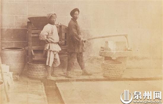 在这些历史照片中,有一部分是普通民众生产生活的瞬间。譬如,1895年拍摄的中国新郎、新娘。照片显示的是一对新婚夫妻,新娘一身珠光宝气,新郎则身着清代袍服。两人之间的案几上还有一盆花和一套厚厚的经书,不知是否别有寓意。泉州建筑工艺举世闻名,摄于1906年的一张照片展示的是泉州三位泥瓦匠正在夯筑一堵红砖墙的画面。清末,人们是如何榨糖的呢?一张拍摄于1888年—1906年间的照片揭示了其中的部分细节。照片中,人们赶着三头水牛,令其拉磨碾榨甘蔗,借此榨出蔗汁,再经提纯得到蔗糖。同样摄于这个时期的还有磨米的中国男孩、给水稻脱粒的农人、刨木头的中国木工、理发师和他的客户、基督徒的墓地葬礼、在哀悼仪式上的孩童等照片,它们共同把我们拉回了百年前的老泉州,让我们体会这座城市的历史现场感与旧日的生活气息。