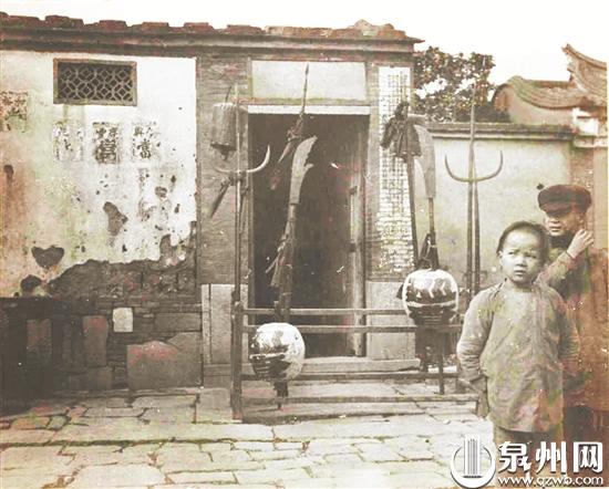 另一张1912年拍摄的名为“泉州官署门外的兵器”照片也引起了我们的注意,要知道1912年恰好是清朝灭亡的那一年。照片中只拍摄了“官署”的一个侧门,门口摆放着一个立有多种兵器的木架子,架子上还有两个手提灯笼,灯罩上写着“巡查”。门前有一男子带着一个小孩。从这些景物来看,这“官署”似乎是个捕快房或衙役房之类的场所。
