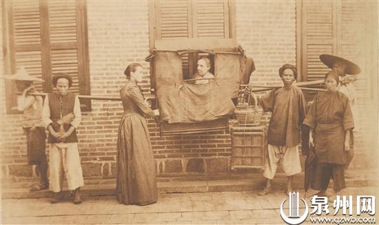 1894年的这张泉州街景照展现了乘坐轿子的女传教士莉莉娅·格雷厄姆与她的仆人们
