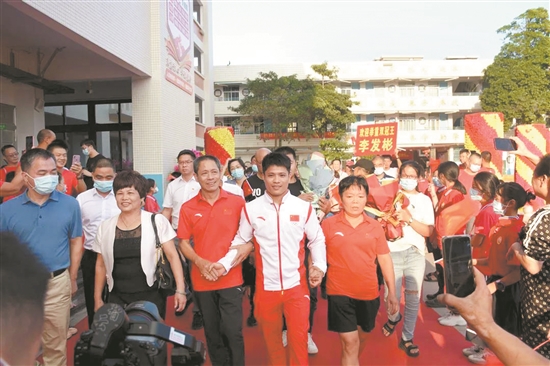 “水头人民热烈欢迎奥运冠军李发彬载誉归来!”“欢迎举重双冠王李发彬”……欢迎仪式上,迎风飘扬的横幅和此起彼伏的欢迎声在阳光下交相辉映,李其锋和蔡印花等来了久别的儿子,激动相拥时不禁抬手默默拭泪。
