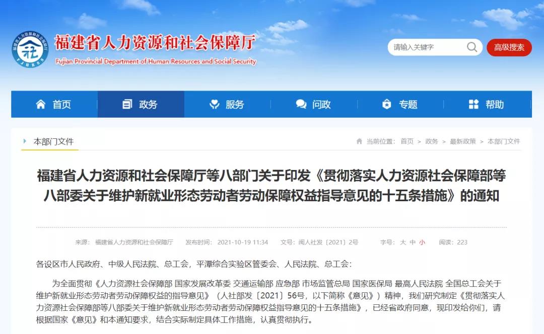 日前,福建八部门联合出台十五条措施,通过完善社会保险政策、落实休息休假制度、安全卫生责任制度等切实保障他们的权益,促进平台经济规范健康持续发展。