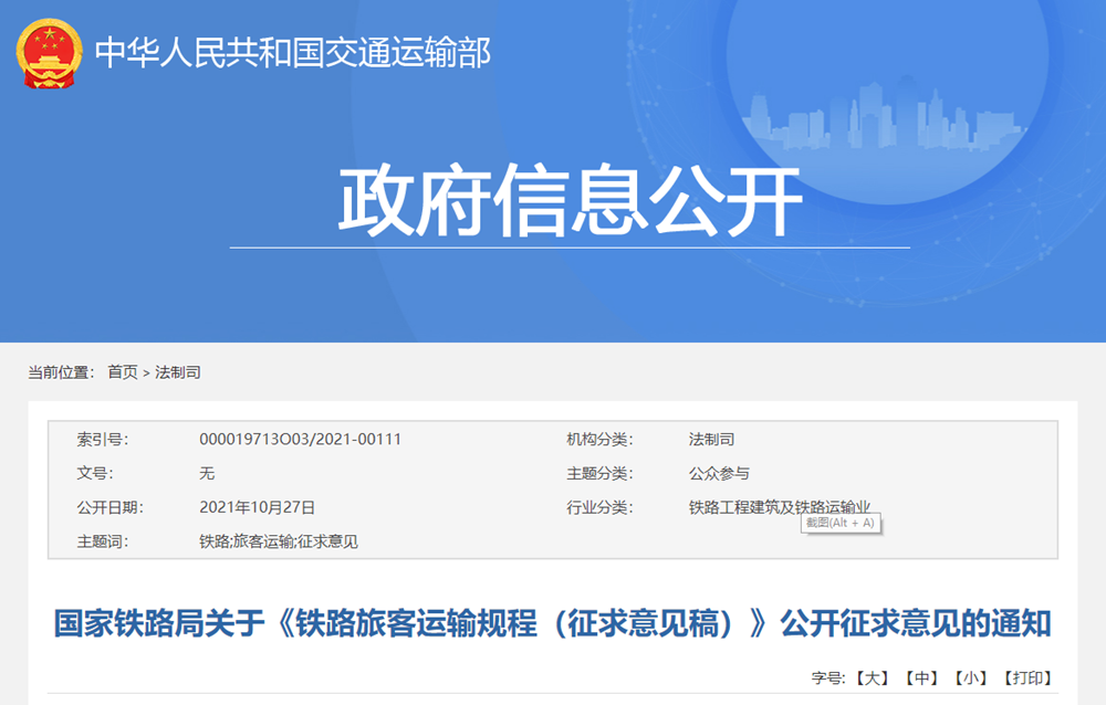 近日,国家铁路局在交通运输部官网发布关于《铁路旅客运输规程(征求意见稿)》公开征求意见的通知,意见反馈截止时间为2021年11月27日。