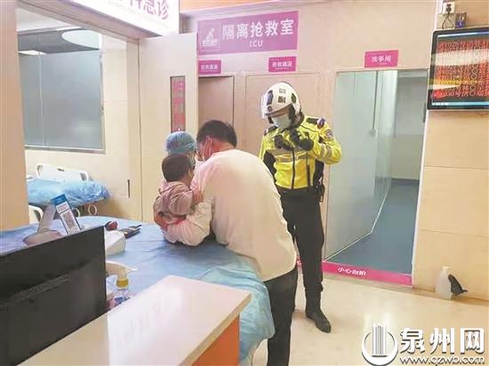 泉州网11月3日讯(记者黄枫 通讯员傅振锋 摄)11月1日晚高峰期间,鲤城交警接指挥中心指令,称有一辆闽CT8560的士需送小孩紧急就医。受伤的孩子不到一周岁,从推车上翻下摔倒,后脑着地,伴有呕吐,情况十分危急。接报后,鲤城交警立刻调派最近的铁骑巡逻队员在城雕环岛等候并引导该车快速前往市儿童医院。其间,铁骑队员一边警示前方车辆提前让行,一边协调所经红绿灯路口绿灯放行,仅用4分钟便将孩子快速平安送至医院,争取了宝贵的治疗时间。据了解,目前小孩情况稳定。