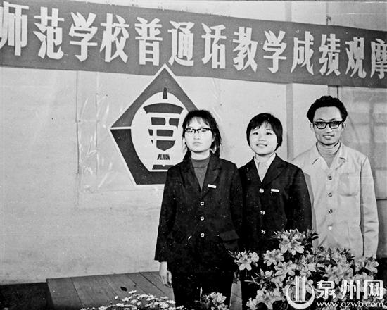 1983年王建设在泉州幼师任教时,指导学生曾晓芬(中)等参加省中等师范学校普通话教学成绩观摩会,获个人一等奖、集体二等奖。(图片由受访者提供)