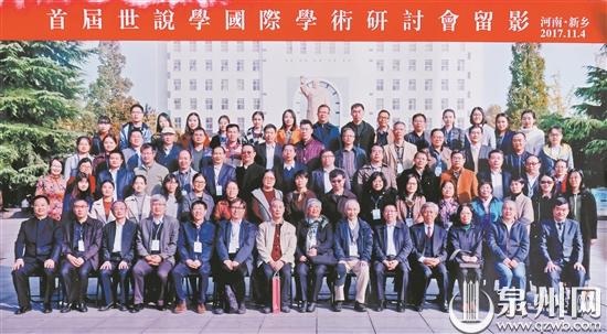 王建设(前排左起三)2017年参加首届世说学国际学术研讨会。(图片由受访者提供)