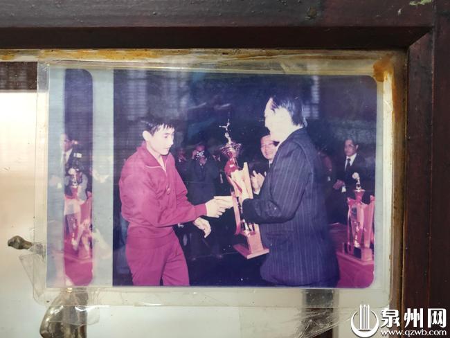陈天龙家中旧照,这是陈天龙(左)年轻时捧杯的现场。